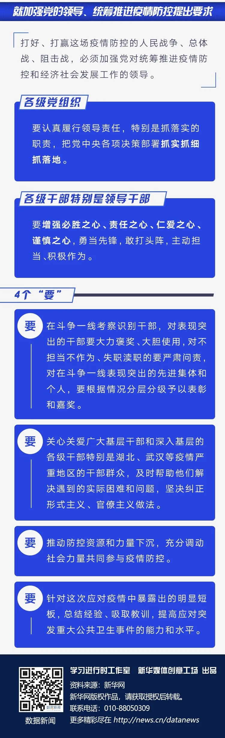 習(xí)近平指出,打好、打贏這場(chǎng)疫情防控的人民戰(zhàn)爭(zhēng)、總體戰(zhàn)、阻擊戰(zhàn),必須加強(qiáng)黨對(duì)統(tǒng)籌推進(jìn)疫情防控和經(jīng)濟(jì)社會(huì)發(fā)展工作的領(lǐng)導(dǎo)。各級(jí)黨組織要認(rèn)真履行領(lǐng)導(dǎo)責(zé)任,特別是抓落實(shí)的職責(zé),把黨中央各項(xiàng)決策部署抓實(shí)抓細(xì)抓落地。各級(jí)干部特別是領(lǐng)導(dǎo)干部要增強(qiáng)必勝之心、責(zé)任之心、仁愛之心、謹(jǐn)慎之心,勇當(dāng)先鋒,敢打頭陣,主動(dòng)擔(dān)當(dāng)、積極作為。要在斗爭(zhēng)一線考察識(shí)別干部,對(duì)表現(xiàn)突出的干部要大力褒獎(jiǎng)、大膽使用,對(duì)不擔(dān)當(dāng)不作為、失職瀆職的要嚴(yán)肅問責(zé),對(duì)在斗爭(zhēng)一線表現(xiàn)突出的先進(jìn)集體和個(gè)人,要根據(jù)情況分層分級(jí)予以表彰和嘉獎(jiǎng)。要關(guān)心關(guān)愛廣大基層干部和深入基層的各級(jí)干部特別是湖北、武漢等疫情嚴(yán)重地區(qū)的干部群眾,及時(shí)幫助他們解決遇到的實(shí)際困難和問題,堅(jiān)決糾正形式主義、官僚主義做法。要推動(dòng)防控資源和力量下沉,充分調(diào)動(dòng)社會(huì)力量共同參與疫情防控。要針對(duì)這次應(yīng)對(duì)疫情中暴露出的明顯短板,總結(jié)經(jīng)驗(yàn)、吸取教訓(xùn),提高應(yīng)對(duì)突發(fā)重大公共衛(wèi)生事件的能力和水平。