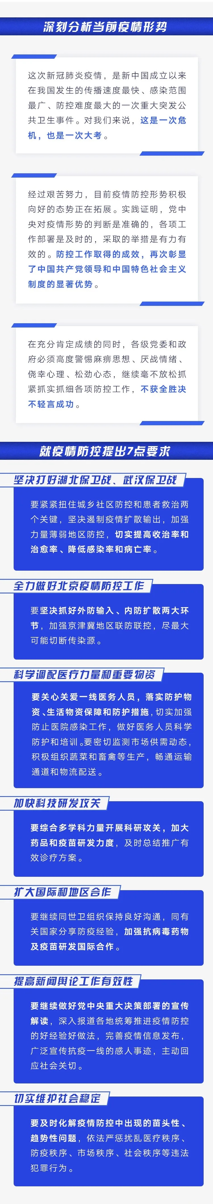 習(xí)近平強(qiáng)調(diào),在充分肯定成績(jī)的同時(shí),各級(jí)黨委和政府必須高度警惕麻痹思想、厭戰(zhàn)情緒、僥幸心理、松勁心態(tài),繼續(xù)毫不放松抓緊抓實(shí)抓細(xì)各項(xiàng)防控工作,不獲全勝?zèng)Q不輕言成功。習(xí)近平提出7點(diǎn)要求。第一,堅(jiān)決打好湖北保衛(wèi)戰(zhàn)、武漢保衛(wèi)戰(zhàn)。要緊緊扭住城鄉(xiāng)社區(qū)防控和患者救治兩個(gè)關(guān)鍵,堅(jiān)決遏制疫情擴(kuò)散輸出,加強(qiáng)力量薄弱地區(qū)防控,切實(shí)提高收治率和治愈率、降低感染率和病亡率。第二,全力做好北京疫情防控工作。要堅(jiān)決抓好外防輸入、內(nèi)防擴(kuò)散兩大環(huán)節(jié),加強(qiáng)京津冀地區(qū)聯(lián)防聯(lián)控,盡最大可能切斷傳染源。第三,科學(xué)調(diào)配醫(yī)療力量和重要物資。要關(guān)心關(guān)愛一線醫(yī)務(wù)人員,落實(shí)防護(hù)物資、生活物資保障和防護(hù)措施,切實(shí)加強(qiáng)防止醫(yī)院感染工作,做好醫(yī)務(wù)人員科學(xué)防護(hù)和培訓(xùn)。要密切監(jiān)測(cè)市場(chǎng)供需動(dòng)態(tài),積極組織蔬菜和畜禽等生產(chǎn),暢通運(yùn)輸通道和物流配送。第四,加快科技研發(fā)攻關(guān)。要綜合多學(xué)科力量開展科研攻關(guān),加大藥品和疫苗研發(fā)力度,及時(shí)總結(jié)推廣有效診療方案。第五,擴(kuò)大國(guó)際和地區(qū)合作。要繼續(xù)同世衛(wèi)組織保持良好溝通,同有關(guān)國(guó)家分享防疫經(jīng)驗(yàn),加強(qiáng)抗病毒藥物及疫苗研發(fā)國(guó)際合作。第六,提高新聞?shì)浾摴ぷ饔行?。要繼續(xù)做好黨中央重大決策部署的宣傳解讀,深入報(bào)道各地統(tǒng)籌推進(jìn)疫情防控的好經(jīng)驗(yàn)好做法,完善疫情信息發(fā)布,廣泛宣傳抗疫一線的感人事跡,主動(dòng)回應(yīng)社會(huì)關(guān)切。第七,切實(shí)維護(hù)社會(huì)穩(wěn)定。要及時(shí)化解疫情防控中出現(xiàn)的苗頭性、趨勢(shì)性問題,依法嚴(yán)懲擾亂醫(yī)療秩序、防疫秩序、市場(chǎng)秩序、社會(huì)秩序等違法犯罪行為。