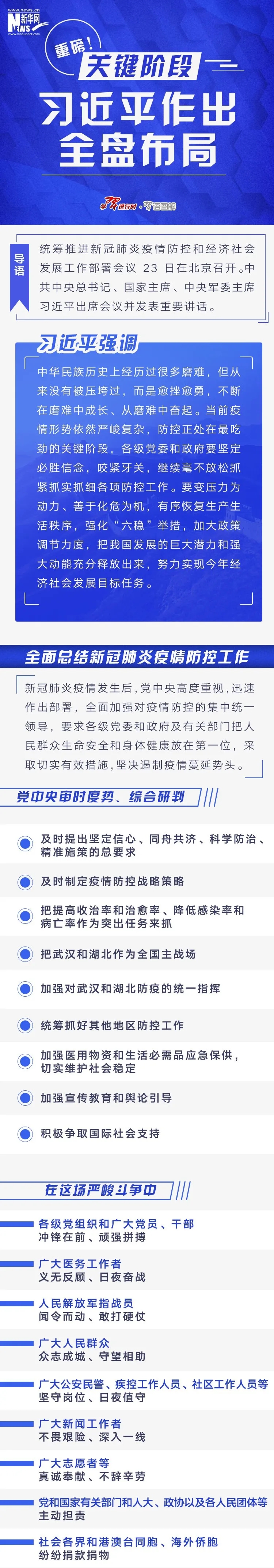 2月23日,統(tǒng)籌推進(jìn)新冠肺炎疫情防控和經(jīng)濟(jì)社會(huì)發(fā)展工作部署會(huì)議在北京召開。中共中央總書記、國(guó)家主席、中央軍委主席習(xí)近平出席會(huì)議并發(fā)表重要講話。