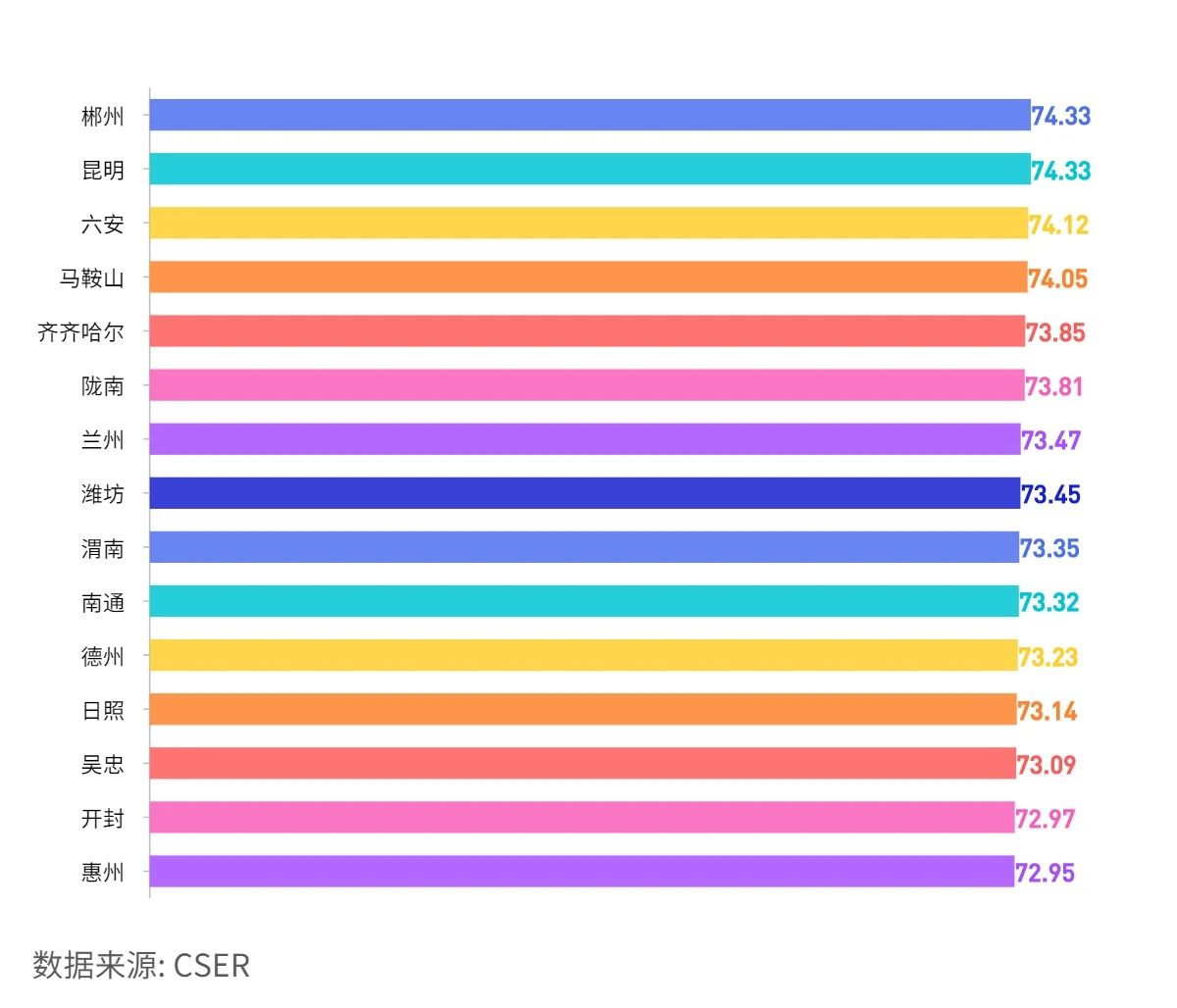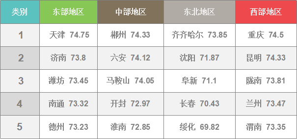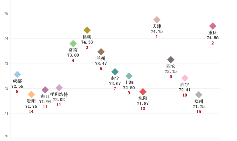 天津74.75,重慶74.5,濟(jì)南73.8,西安73.15,青島73.03,成都72.56,上海72.5,深圳72.19,沈陽(yáng)71.87,杭州70.71,北京70.5,長(zhǎng)春70.43,廣州69.36,寧波69.07,武漢69.02,哈爾濱68.48,大連67.34,南京66.81,廈門64.32。