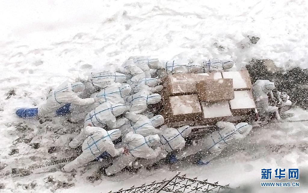 漫天飛雪的路上,十幾個人推著一輛滿載貨物的三輪車艱難前行,數(shù)次滑倒又爬起后,身上的防護(hù)服仿佛與天地融為一體……
