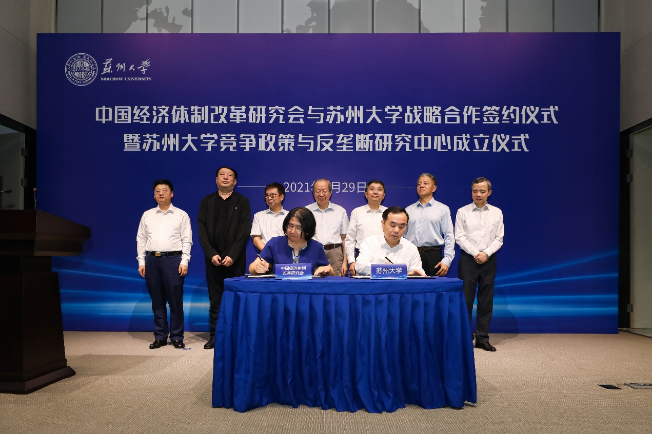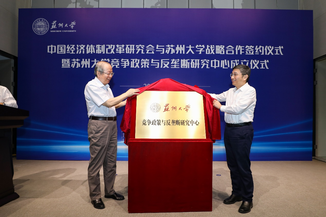 9月29日上午,彭森會長出席了中國經(jīng)濟(jì)體制改革研究會與蘇州大學(xué)共同舉辦的戰(zhàn)略合作協(xié)議簽署暨蘇州大學(xué)競爭政策與反壟斷研究中心揭牌儀式。蘇州大學(xué)黨委書記江涌代表蘇州大學(xué)致歡迎辭,彭森會長、江蘇省市場監(jiān)管局陳琪宏副局長、蘇州市副市長楊知評為會議致辭。