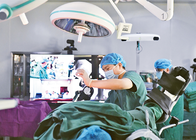 數(shù)字技術(shù)與醫(yī)療、農(nóng)業(yè)、能源、建筑、服務(wù)業(yè)等緊密結(jié)合,正在推動(dòng)傳統(tǒng)產(chǎn)業(yè)日益高端化、智能化。圖為2021年4月19日,拉薩市人民醫(yī)院骨科醫(yī)生在北京積水潭醫(yī)院專家遠(yuǎn)程指導(dǎo)下,使用骨科機(jī)器人開展骨科手術(shù)?!⌒氯A社記者 孫瑞博 /攝