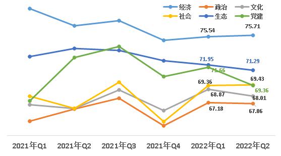1、經(jīng)濟(jì)、社會(huì)領(lǐng)域小幅上升。從六大領(lǐng)域來(lái)看,經(jīng)濟(jì)領(lǐng)域得分75.71,政治領(lǐng)域得分67.06 ,文化領(lǐng)域得分68.01,社會(huì)領(lǐng)域得分69.43,生態(tài)領(lǐng)域得分71.29,黨建領(lǐng)域得分69.36。與上一季度相比,經(jīng)濟(jì)、社會(huì)領(lǐng)域小幅上升,其他領(lǐng)域均下降。其中黨建領(lǐng)域降幅最大,下降2.3。