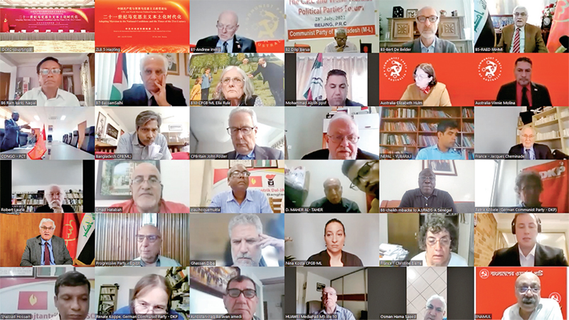 2022年7月28日,中國共產(chǎn)黨與世界馬克思主義政黨論壇舉行。習(xí)近平總書記在賀信中強(qiáng)調(diào),中國共產(chǎn)黨愿同各國馬克思主義政黨加強(qiáng)交流對(duì)話,立足本國國情,把準(zhǔn)時(shí)代脈搏,不斷豐富和發(fā)展馬克思主義,在攜手推動(dòng)構(gòu)建人類命運(yùn)共同體的進(jìn)程中讓馬克思主義展現(xiàn)出更強(qiáng)大的真理力量。圖為外國政黨代表線上參加論壇。 中共中央對(duì)外聯(lián)絡(luò)部供圖
