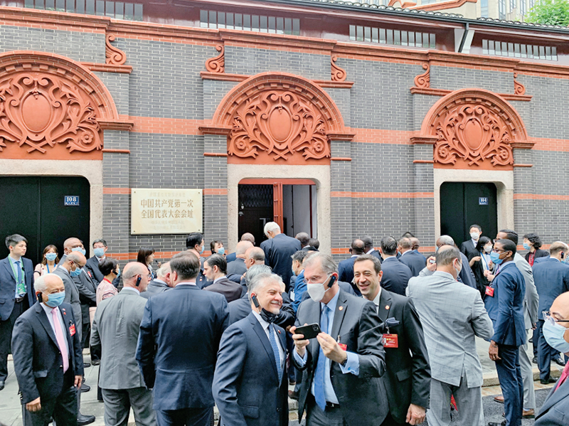 2021年6月16日,“中國共產(chǎn)黨的故事——習(xí)近平新時(shí)代中國特色社會(huì)主義思想在上海的實(shí)踐”特別對(duì)話會(huì)在上海舉行。近100個(gè)國家、126個(gè)政黨和友好組織的740多名代表通過視頻連線參加對(duì)話會(huì),40多個(gè)國家駐華大使現(xiàn)場(chǎng)出席會(huì)議。圖為與會(huì)駐華使節(jié)參觀中共一大會(huì)址。 人民網(wǎng) 馬作鵬/攝