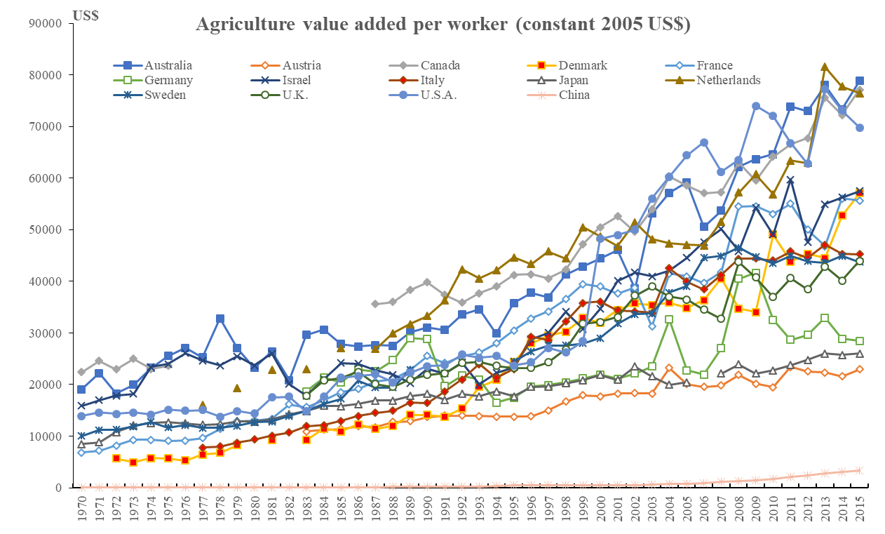 如圖5,西方城市化過程中兩個(gè)收入差距的縮小在中國沒有出現(xiàn)。中國在最快速城市化階段出現(xiàn)了城鄉(xiāng)收入差距拉大,第一是我們只有快速城市化,但沒有城鄉(xiāng)融合。第二是我們城市化的模式是回村的城市化模式。在城市里干工作,干到一定程度再回到農(nóng)村,這是全世界沒有的。第三是農(nóng)業(yè)競爭力下降?,F(xiàn)在一定要有一個(gè)認(rèn)識,農(nóng)業(yè)的份額降到10%以后,各個(gè)國家的農(nóng)業(yè)到底在干什么?我們現(xiàn)在想到農(nóng)業(yè)到10%,再到2%、1%,農(nóng)業(yè)就可有可無了,這種觀點(diǎn)是錯(cuò)誤的。所有國家的農(nóng)業(yè)在降到10%以后,農(nóng)業(yè)在變強(qiáng),它的農(nóng)業(yè)和原來的農(nóng)業(yè)完全不一樣。中國由于單向城市化的模式,最后農(nóng)業(yè)競爭力進(jìn)一步下降。(如圖6)我們現(xiàn)在只有6%、7%的農(nóng)業(yè),這個(gè)農(nóng)業(yè)的競爭力是下降的,背后是農(nóng)業(yè)成本上升,所有成本都在上升。