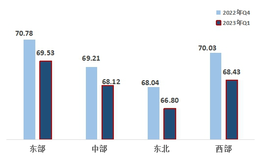 2、中部地區(qū)落后于西部地區(qū)。東部、西部、中部、東北地區(qū)指數(shù)分別為69.53、68.43、68.12、66.80。東部地區(qū)領(lǐng)先,西部地區(qū)排名第二,連續(xù)四個季度超越中部地區(qū),東北地區(qū)最后。與上一季度相比,四大區(qū)域均有下滑,東北地區(qū)降幅較大。