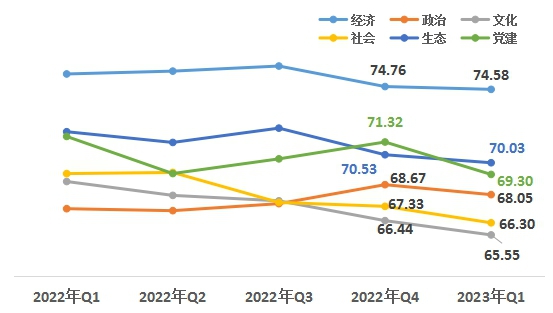 1、從領(lǐng)域來看,黨建、社會領(lǐng)域降幅高于其他領(lǐng)域。第一季度,經(jīng)濟領(lǐng)域74.58,政治領(lǐng)域68.05,文化領(lǐng)域65.55,社會領(lǐng)域66.30,生態(tài)領(lǐng)域70.03,黨建領(lǐng)域69.30。與上一季度相比,六大領(lǐng)域均有下降,黨建、社會領(lǐng)域降幅較大。