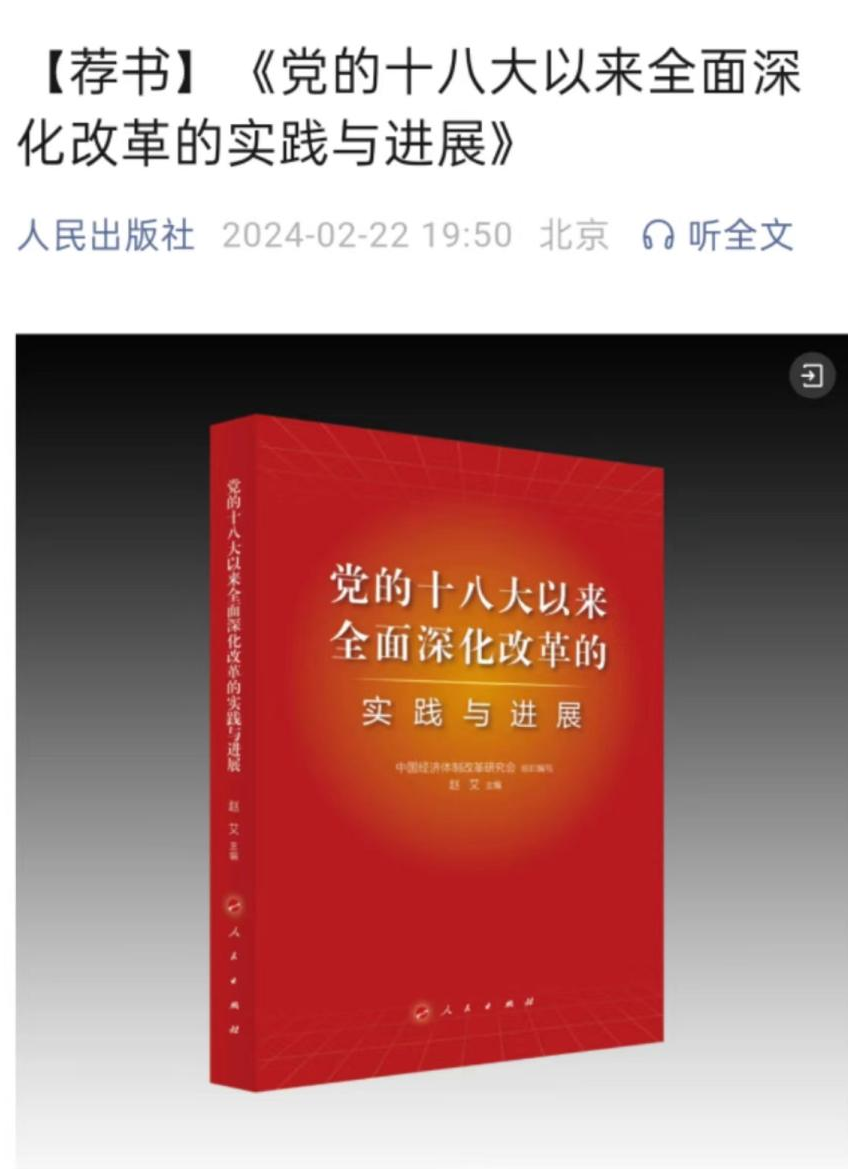 2024年2月22日,由我會(huì)組織編寫,會(huì)長彭森作序、常務(wù)副會(huì)長兼秘書長趙艾主編的《黨的十八大以來全面深化改革的實(shí)踐與進(jìn)展》一書,入選人民出版社官方微信公眾號(hào)[薦書]欄目,成為人民出版社推薦的新書。
