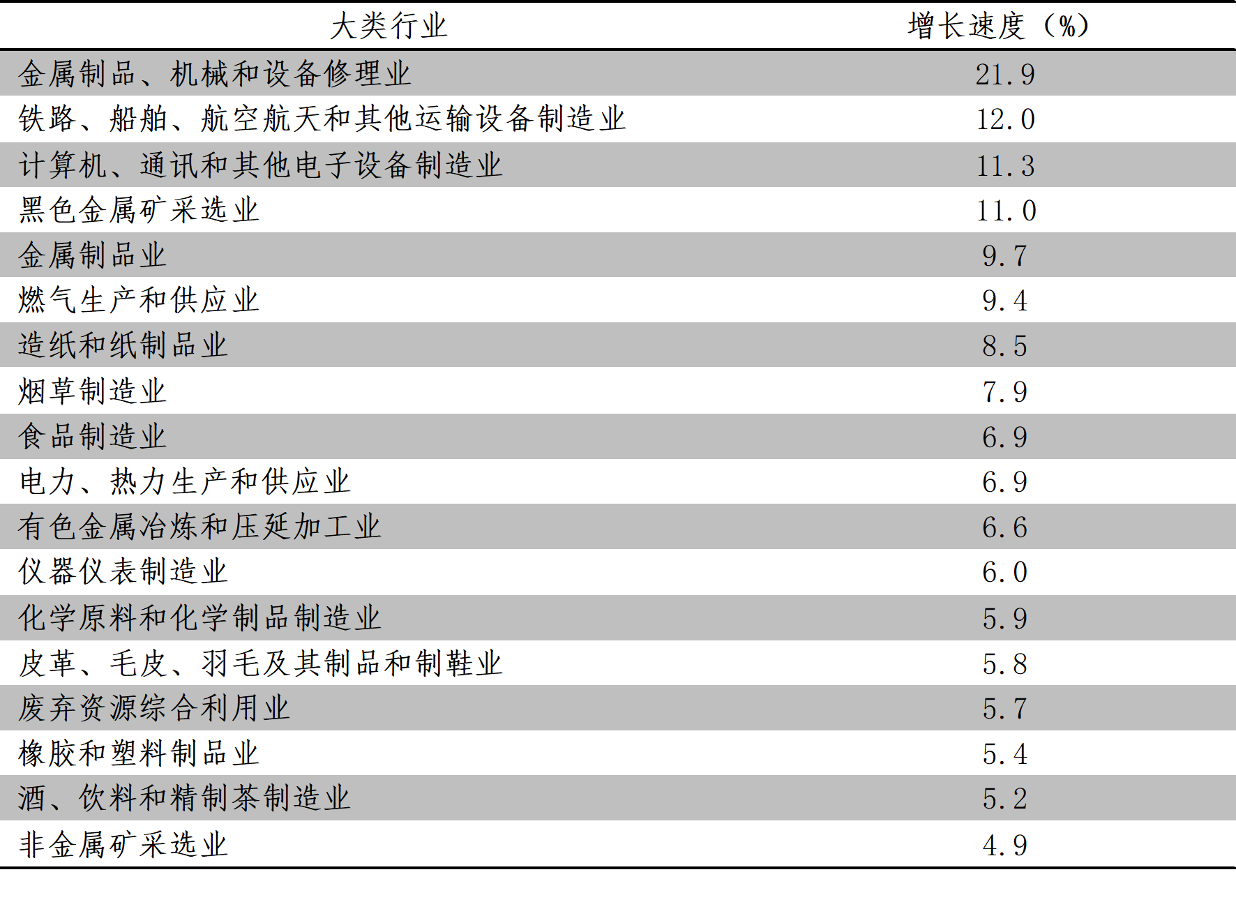 8月份,增長速度超過規(guī)模以上工業(yè)增長4.5%的主要大類行業(yè)共有18個,即金屬制品、機(jī)械和設(shè)備修理業(yè)同比增長21.9%,鐵路、船舶、航空航天和其他運(yùn)輸設(shè)備制造業(yè)增長12.0%,計(jì)算機(jī)、通訊和其他電子設(shè)備制造業(yè)增長11.3%,黑色金屬礦采選業(yè)增長11.0%,金屬制品業(yè)增長9.7%,燃?xì)馍a(chǎn)和供應(yīng)業(yè)增長9.4%,造紙和紙制品業(yè)增長8.5%,煙草制造業(yè)增長7.9%,食品制造業(yè)增長6.9%,電力、熱力生產(chǎn)和供應(yīng)業(yè)增長6.9%,有色金屬冶煉和壓延加工業(yè)增長6.6%,儀器儀表制造業(yè)增長6.0%,化學(xué)原料和化學(xué)制品制造業(yè)增長5.9%,皮革、毛皮、羽毛及其制品和制鞋業(yè)增長5.8%,廢棄資源綜合利用業(yè)增長5.7%,橡膠和塑料制品業(yè)增長5.4%,酒飲料和精制茶制造業(yè)增長百分之5.2%,非金屬礦采選業(yè)增長4.9%。