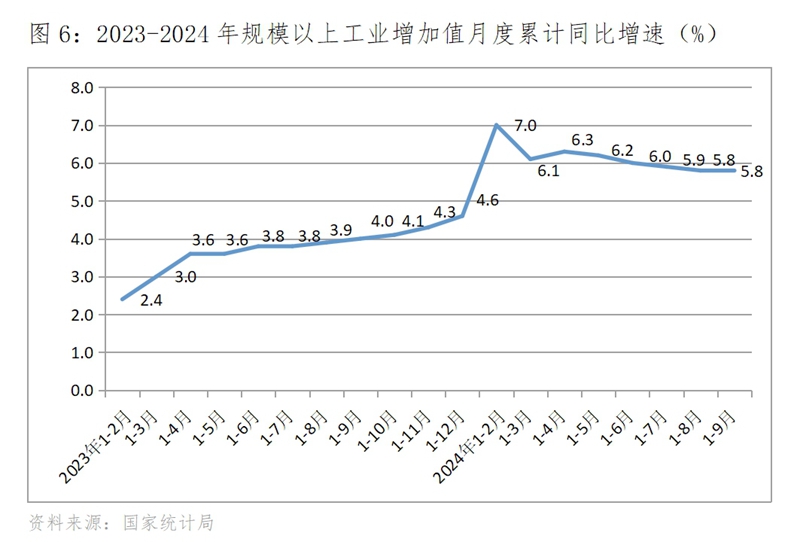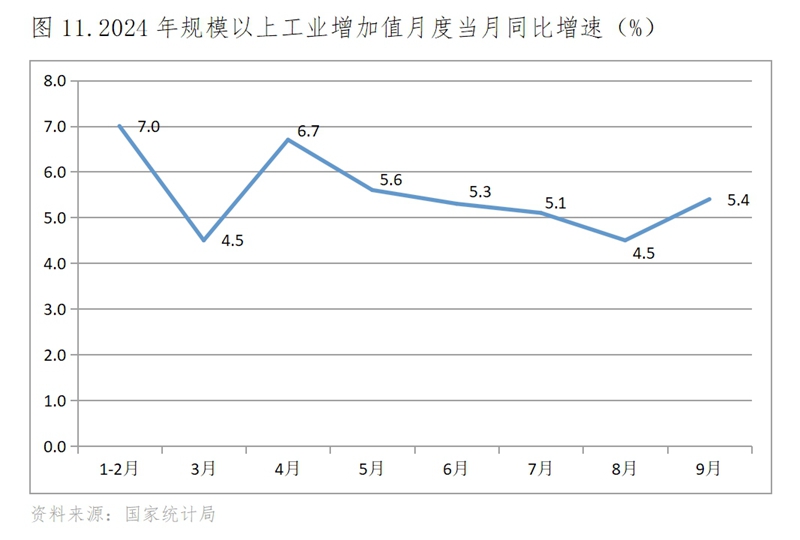 (一)工業(yè)生產(chǎn)增速基本上持續(xù)回落,9月份回升。規(guī)模以上工業(yè)增加值增速年初開局走高,1-2月份同比增長7.0%,3月份增速回落,4月份增速回升,但自此以后持續(xù)走低,到8月份增速為4.5%,9月份增速呈現(xiàn)回升,同比增長5.4%。