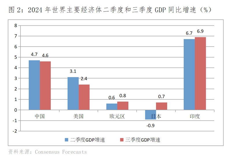 Consensus Forecasts 9月份最新預(yù)測,世界主要經(jīng)濟體GDP增速有升有落,呈現(xiàn)出走勢分化的特征。三季度美國GDP同比增長2.4%,比二季度增長3.1%回落0.7個百分點;歐元區(qū)增長0.8%,比二季度增長0.6%回升0.2個百分點;日本增長0.7%,二季度下降0.9%,增速由負(fù)轉(zhuǎn)正;印度增長6.9%,比二季度增長6.7%回升0.2個百分點。