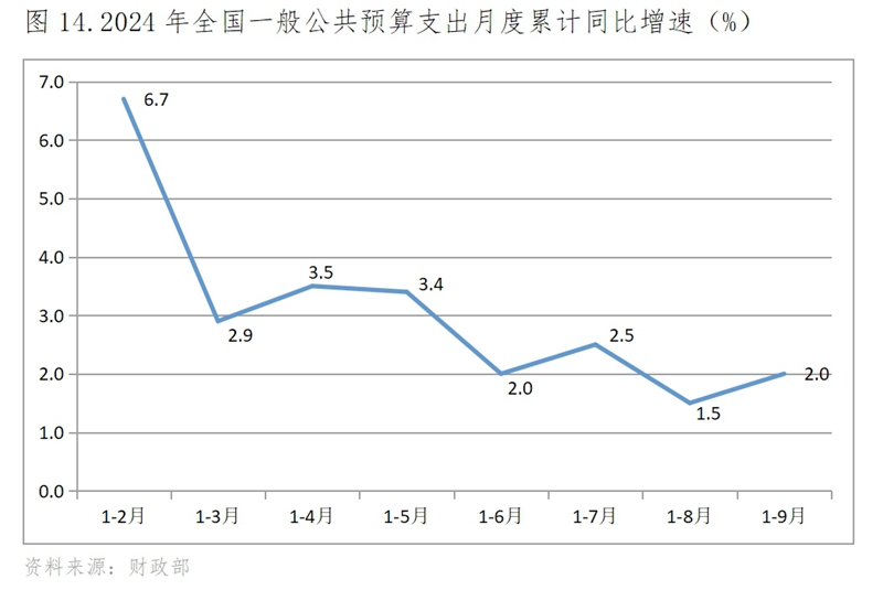 (四)財政支出增速在低速波動中走低,9月份略有回升。財政支出增速年初也是高開,1-2月份財政支出同比增長6.7%,1-3月份回落到增長2.9%,隨后就在低速波動中趨勢性回落,1-9月份增長2.0%。需要特別指出的是,如果按月度增速計算的話,財政支出增速波動會更大一些。