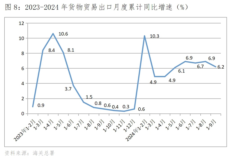 (五)出口增速在較大波動中出現(xiàn)放緩,9月份回落。今年以來的出口增速波動還不小,1-2月份出口同比增長10.3%,3月份下降3.8%,隨后保持了兩個月增速的回升,自6月份增速開始波動回落,到9月份回落到增長1.6%。