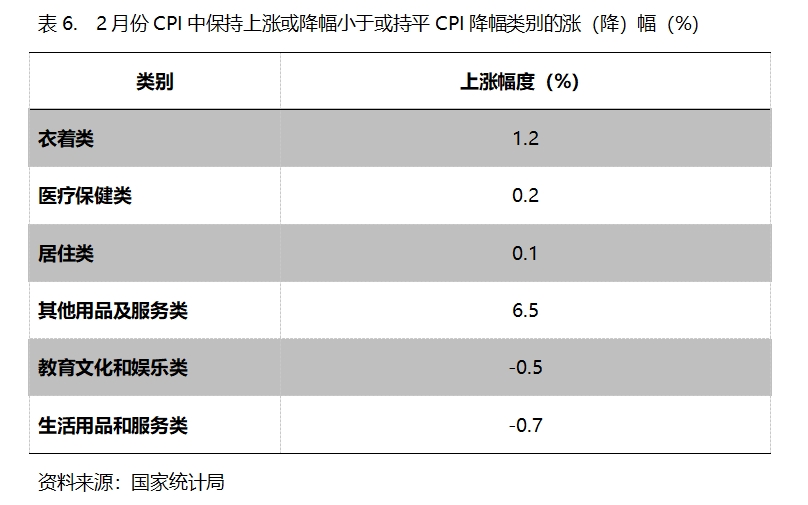 CPI中保持上漲的類別共4類,即衣著類價(jià)格同比上漲1.2%,醫(yī)療保健類上漲0.2%,居住類上漲0.1%,其他用品和服務(wù)類上漲6.5%;降幅小于或持平CPI降幅的類別共2類,即教育文化和娛樂(lè)類下降0.5%,生活用品及服務(wù)下降0.7%。