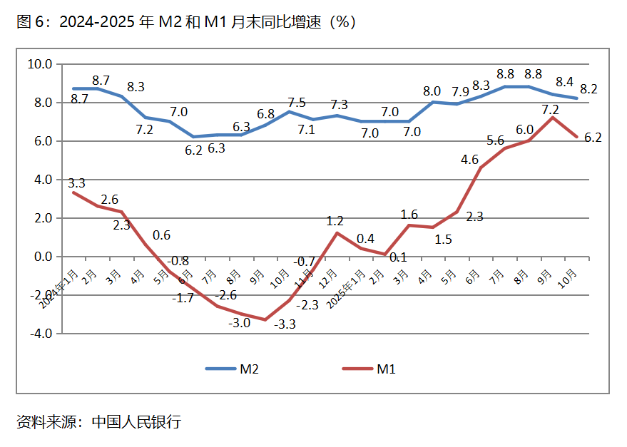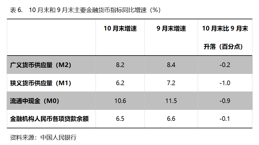 六、M2增速持續(xù)回落。10月末,廣義貨幣供應(yīng)量(M2)同比增長8.2%,比9月末增長8.4%回落0.2個(gè)百分點(diǎn),9月末比8月末增長8.8%回落0.4個(gè)百分點(diǎn);狹義貨幣供應(yīng)量(M1)同比增長6.2%,比9月末增長7.2%回落1.0個(gè)百分點(diǎn),9月末增幅比8月末增長6.0%回升1.2個(gè)百分點(diǎn);流通中貨幣(M0)同比增長10.6%,比9月末增長11.5%回落0.9個(gè)百分點(diǎn),9月末比8月末增長11.7%回落0.2個(gè)百分點(diǎn)。10月份末,M2、M1和M0增速均出現(xiàn)了回落,需要關(guān)注其對(duì)經(jīng)濟(jì)運(yùn)行走勢(shì)的影響。