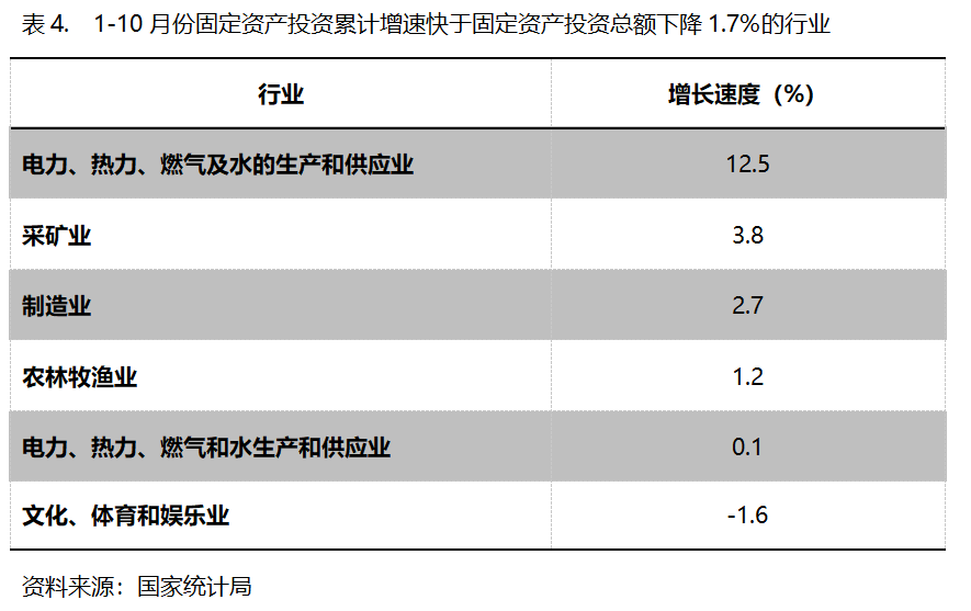 1-10月份,固定資產(chǎn)投資累計(jì)增速快于固定資產(chǎn)投資總額下降1.7%的行業(yè)共6個(gè),即電力、熱力、燃?xì)饧八纳a(chǎn)和供應(yīng)業(yè)增長12.5%,采礦業(yè)增長3.8%,制造業(yè)增長2.7%。農(nóng)林牧漁業(yè)增長1.2%,交通運(yùn)輸、倉儲(chǔ)和郵政業(yè)增長0.1%,文化、體育和娛樂業(yè)下降1.6%。