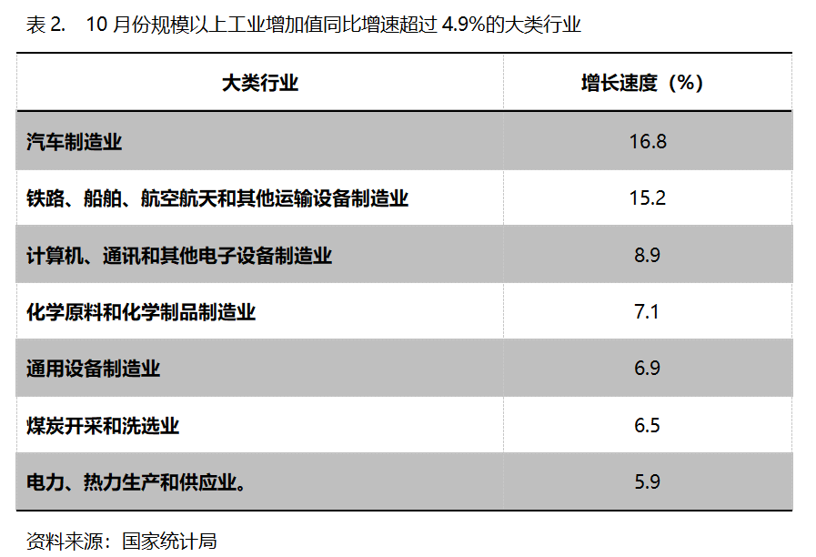 10月份,增長速度超過規(guī)模以上工業(yè)增長4.9%的主要大類行業(yè)共有7個(gè),即汽車制造業(yè)增長16.8%,鐵路、船舶、航空航天和其他運(yùn)輸設(shè)備制造業(yè)同比增長15.2%,計(jì)算機(jī)、通訊和其他電子設(shè)備制造業(yè)增長8.9%,化學(xué)原料和化學(xué)制品制造業(yè)增長7.1%,通用設(shè)備制造業(yè)增長6.9%,煤炭開采和洗選業(yè)增長6.5%,電力、熱力生產(chǎn)和供應(yīng)業(yè)增長5.9%。