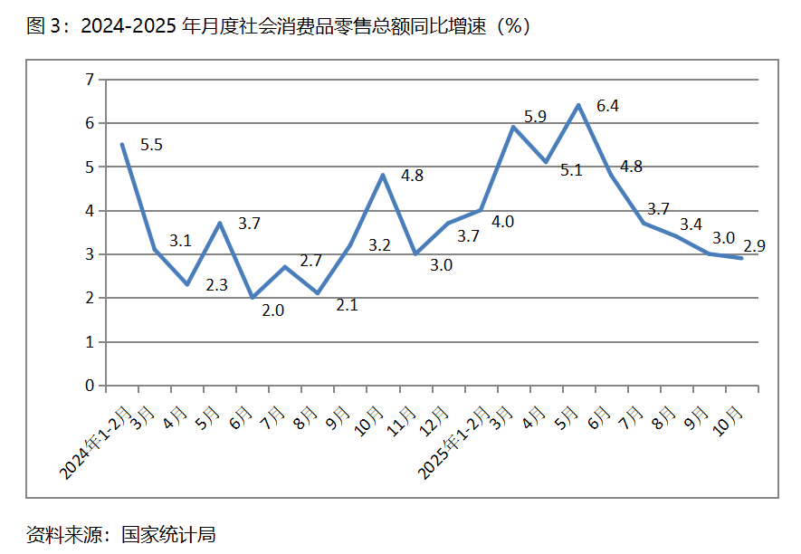 三、零售增速持續(xù)回落。10月份,社會(huì)消費(fèi)品零售總額同比增長2.9%,比9月份增長3.0%回落了0.1個(gè)百分點(diǎn),9月份比8月份增長3.4%回落了0.4個(gè)百分點(diǎn),其中,餐飲收入增速回升,商品零售額增速回落,10月份餐飲收入同比增長3.8%,比9月份增長0.9%回升了2.9個(gè)百分點(diǎn);商品零售額增長2.8%,比9月份增長3.3%回落0.5個(gè)百分點(diǎn)。10月份社會(huì)消費(fèi)品零售總額增速是今年以來月份的最低增速。
