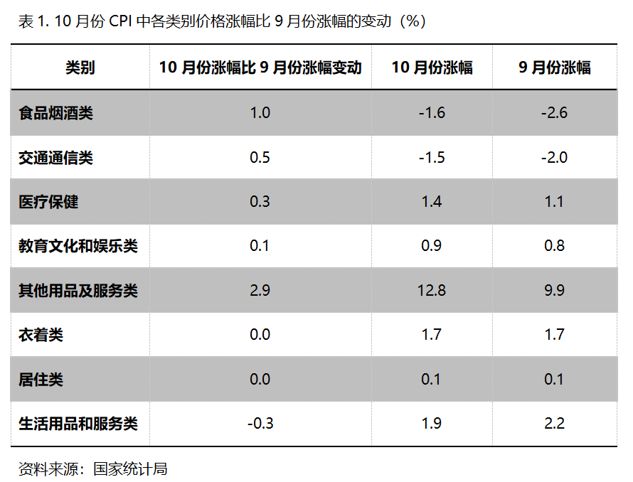 10月份,在CPI 8個(gè)類別中有5個(gè)類別同比漲幅回升,2個(gè)類別持平,1個(gè)類別回落。漲幅回升的5個(gè)類別包括食品類價(jià)格降幅縮小1.0個(gè)百分點(diǎn),交通類降幅縮小0.5個(gè)百分點(diǎn),醫(yī)療保健類漲幅回升0.3個(gè)百分點(diǎn),教育文化和娛樂類漲幅回升0.1個(gè)百分點(diǎn),其他用品和服務(wù)類漲幅回升2.9個(gè)百分點(diǎn);漲幅持平的2 個(gè)類別包括衣著類和居住類;漲幅回落的生活用品及服務(wù)類漲幅回落0.3個(gè)百分點(diǎn)。