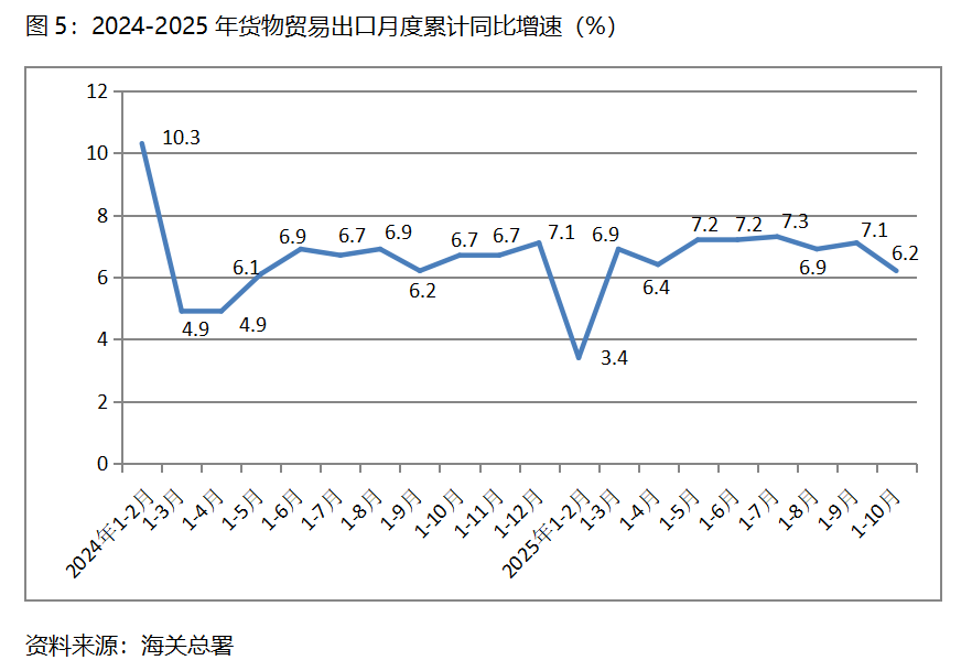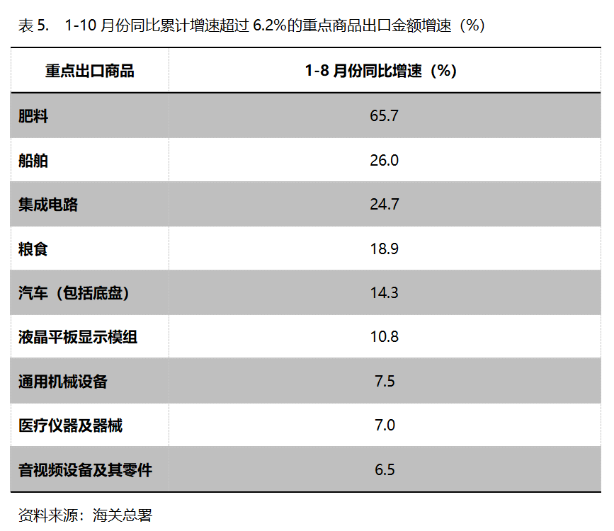 1-10月份,出口金額同比增速超過6.2%的重點(diǎn)商品共有9類,即肥料出口增長65.7%,船舶增長26.0%,集成電路增長24.7%,糧食增長18.9%,汽車(包括底盤)增長14.3%,液晶平板顯示模組增長10.8%,通用機(jī)器設(shè)備增長7.5%,醫(yī)療儀器及器械增長7.0%,音視頻設(shè)備及其零件增長6.5%。
