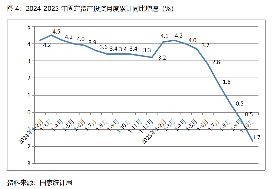 四、投資增速持續(xù)下降。1-10月份,固定資產(chǎn)投資總額同比下降1.7%,比1-9月份下降0.5%擴(kuò)大了1.2個(gè)百分點(diǎn),1-9月份增速由1-8月份增長0.5%轉(zhuǎn)為下降0.5%,增速由年初以來的持續(xù)回落轉(zhuǎn)為連續(xù)兩個(gè)月的下降。1-10月份國有控股投資同比增長0.1%,比1-9月份增長1.0%回落0.9個(gè)百分點(diǎn);民間投資下降4.5%,比1-9月份下降3.1%擴(kuò)大了1.4個(gè)百分點(diǎn)。三次產(chǎn)業(yè)投資中,第一產(chǎn)業(yè)投資同比增長2.9%,比1-9月份增長4.6%回落1.7個(gè)百分點(diǎn);第二產(chǎn)業(yè)投資增長4.8%,比1-9月份增長6.3%回落1.5個(gè)百分點(diǎn);第三產(chǎn)業(yè)投資下降5.3%,比1-9月份下降4.3%擴(kuò)大1.0 百分點(diǎn)。固定資產(chǎn)投資增速自年初以來持續(xù)回落轉(zhuǎn)為近兩個(gè)月的持續(xù)下降,呈現(xiàn)出投資后勁乏力的苗頭。