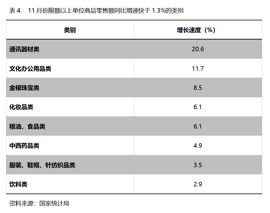 11月份,限額以上單位商品零售額同比增速快于社會(huì)消費(fèi)品零售總額1.3%增速的共有8類(lèi),即通訊器材類(lèi)增長(zhǎng)20.6%,文化辦公用品類(lèi)增長(zhǎng)11.7%,金銀珠寶類(lèi)增長(zhǎng)8.5%,化妝品類(lèi)增長(zhǎng)6.1%,糧油、食品類(lèi)增長(zhǎng)6.1%,中西藥品類(lèi)增長(zhǎng)4.9%,服裝、鞋帽、針紡織品類(lèi)增長(zhǎng)3.5%,飲料類(lèi)增長(zhǎng)2.9%。