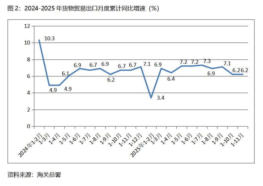 二、出口增速由落轉(zhuǎn)平。1-11月份,貨物出口同比增長(zhǎng)6.2%,與1-10月份增長(zhǎng)6.2%持平,1-10月份比1-9月份增長(zhǎng)7.1%回落0.9個(gè)百分點(diǎn)。貨物出口對(duì)主要貿(mào)易出口經(jīng)濟(jì)體增速有升有落有平,1-11月份對(duì)歐盟出口同比增長(zhǎng)8.9%,比1-10月份對(duì)歐盟出口同比增長(zhǎng)8.4%回升0.5個(gè)百分點(diǎn);對(duì)美國(guó)出口下降18.3%,比1-10月份下降17.1%擴(kuò)大1.2個(gè)百分點(diǎn);對(duì)東盟出口增長(zhǎng)14.6%,比1-10月份增長(zhǎng)15.3%回落0.7個(gè)百分點(diǎn);對(duì)拉丁美洲出口增長(zhǎng)7.9%,比1-10月份增長(zhǎng)7.3%回升0.6個(gè)百分點(diǎn);對(duì)非洲出口增長(zhǎng)27.2%,與1-10月份增長(zhǎng)27.2%持平。貨物出口在跌宕起伏的國(guó)際形勢(shì)下仍保持穩(wěn)定增長(zhǎng),彰顯出我國(guó)對(duì)外貿(mào)易的較強(qiáng)韌性。