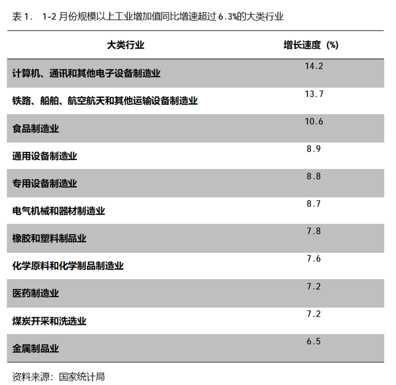 1-2月份,增長(zhǎng)速度超過(guò)或持平規(guī)模以上工業(yè)增長(zhǎng)6.3%的主要大類行業(yè)共有11個(gè),即計(jì)算機(jī)、通訊和其他電子設(shè)備制造業(yè)增長(zhǎng)14.2%,鐵路、船舶、航空航天和其他運(yùn)輸設(shè)備制造業(yè)增長(zhǎng)13.7%,食品制造業(yè)增長(zhǎng)10.6%,通用設(shè)備制造業(yè)增長(zhǎng)8.9%,專用設(shè)備制造業(yè)增長(zhǎng)8.8%,電氣機(jī)械和器材制造業(yè)增長(zhǎng)8.7%,橡膠和塑料制品業(yè)增長(zhǎng)7.8%,化學(xué)原料和化學(xué)制品制造業(yè)增長(zhǎng)7.6%,醫(yī)藥制造業(yè)增長(zhǎng)7.2%,煤炭開采和洗選業(yè)增長(zhǎng)7.2%,金屬制品業(yè)增長(zhǎng)6.5%。