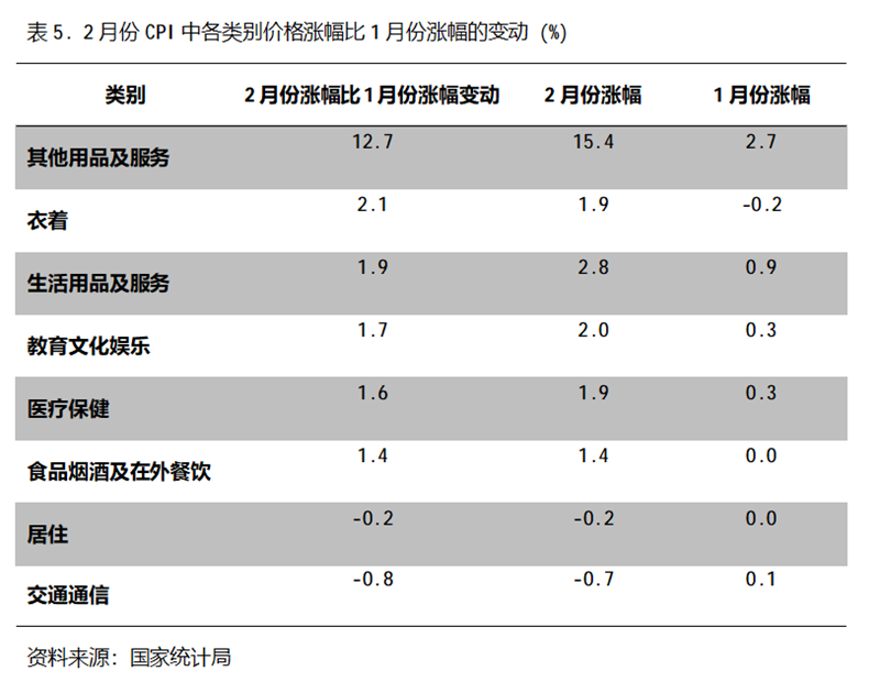 2月份,在CPI 8個(gè)類別中有6個(gè)類別同比漲幅回升,2個(gè)類別回落。漲幅回升的5個(gè)類別包括其他用品及服務(wù)漲幅回升12.7個(gè)百分點(diǎn),衣著由降轉(zhuǎn)漲、漲幅回升2.1個(gè)百分點(diǎn),生活用品及服務(wù)漲幅回升1.9個(gè)百分點(diǎn),教育文化娛樂(lè)漲幅回升1.7個(gè)百分點(diǎn),醫(yī)療保健漲幅回升1.6個(gè)百分點(diǎn),食品煙酒及在外餐飲價(jià)格由平轉(zhuǎn)漲、漲幅回升1.4個(gè)百分點(diǎn),居住由平轉(zhuǎn)降、降幅擴(kuò)大0.2個(gè)百分點(diǎn),交通通信由漲轉(zhuǎn)降、降幅擴(kuò)大0.8個(gè)百分點(diǎn)。