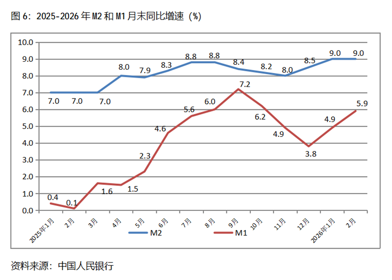 六、M2增速由升轉(zhuǎn)平。2月末,廣義貨幣供應(yīng)量(M2)同比增長(zhǎng)9.0%,與1月份末增長(zhǎng)9.0%持平,1月末增幅比上年末增長(zhǎng)8.5%回升0.5個(gè)百分點(diǎn);狹義貨幣供應(yīng)量(M1)同比增長(zhǎng)5.9%,比1月末增長(zhǎng)4.9%回升1.0個(gè)百分點(diǎn),1月末增幅比上年末增長(zhǎng)3.8%回升1.1個(gè)百分點(diǎn);流通中貨幣(M0)同比增長(zhǎng)14.1%,比1月末增長(zhǎng)2.7%回升11.4個(gè)百分點(diǎn),1月末增幅比上年末增長(zhǎng)10.2%回落7.5個(gè)百分點(diǎn)。2月末,雖然M2增速與M1增速差距進(jìn)一步縮小,但仍還保持著不小的差距。