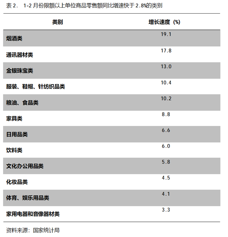1-2月份,限額以上單位商品零售額同比增速快于社會(huì)消費(fèi)品零售總額2.8%增速的共有12類,即煙酒類增長(zhǎng)19.1%,通訊器材類增長(zhǎng)17.8%,金銀珠寶類增長(zhǎng)13.0%,服裝、鞋帽、針紡織品類增長(zhǎng)10.4%,糧油、食品類增長(zhǎng)10.2%,家具類增長(zhǎng)8.8%,日用品類增長(zhǎng)6.6%,飲料類增長(zhǎng)6.0%,文化辦公用品類增長(zhǎng)5.8%,化妝品類增長(zhǎng)4.5%,體育、娛樂(lè)類增長(zhǎng)4.1%,家用電器和音像類增長(zhǎng)3.3%。