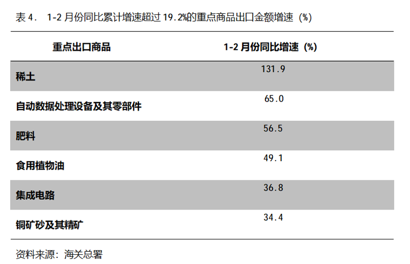 1-2月份,出口金額同比增速超過(guò)19.2%的重點(diǎn)商品共有6類,即稀土出口同比增長(zhǎng)131.9%,自動(dòng)數(shù)據(jù)處理設(shè)備及其零部件增長(zhǎng)65.0%,肥料出口增長(zhǎng)56.5%,食用植物油增長(zhǎng)49.1%,集成電路增長(zhǎng)36.8%,銅礦砂及其精礦增長(zhǎng)34.4%。