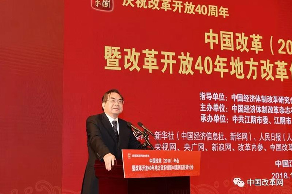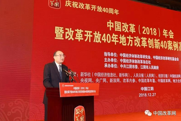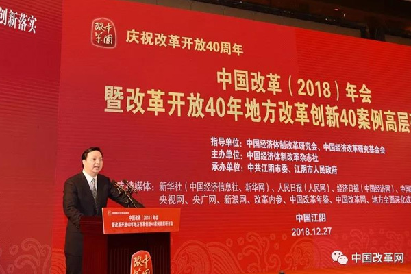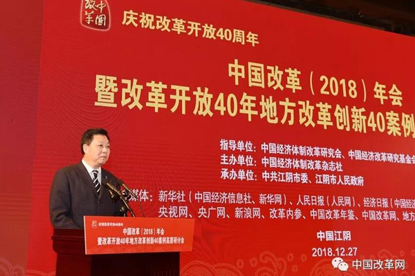 2018年12月27日,由中國經(jīng)濟體制改革研究會、中國經(jīng)濟改革研究基金會指導(dǎo),中國經(jīng)濟體制改革雜志社主辦,中共江陰市委、江陰市人民政府承辦的“慶祝改革開放40周年——中國改革(2018)年會暨改革開放40年地方改革創(chuàng)新40案例高層研討會”在江蘇省江陰市召開。