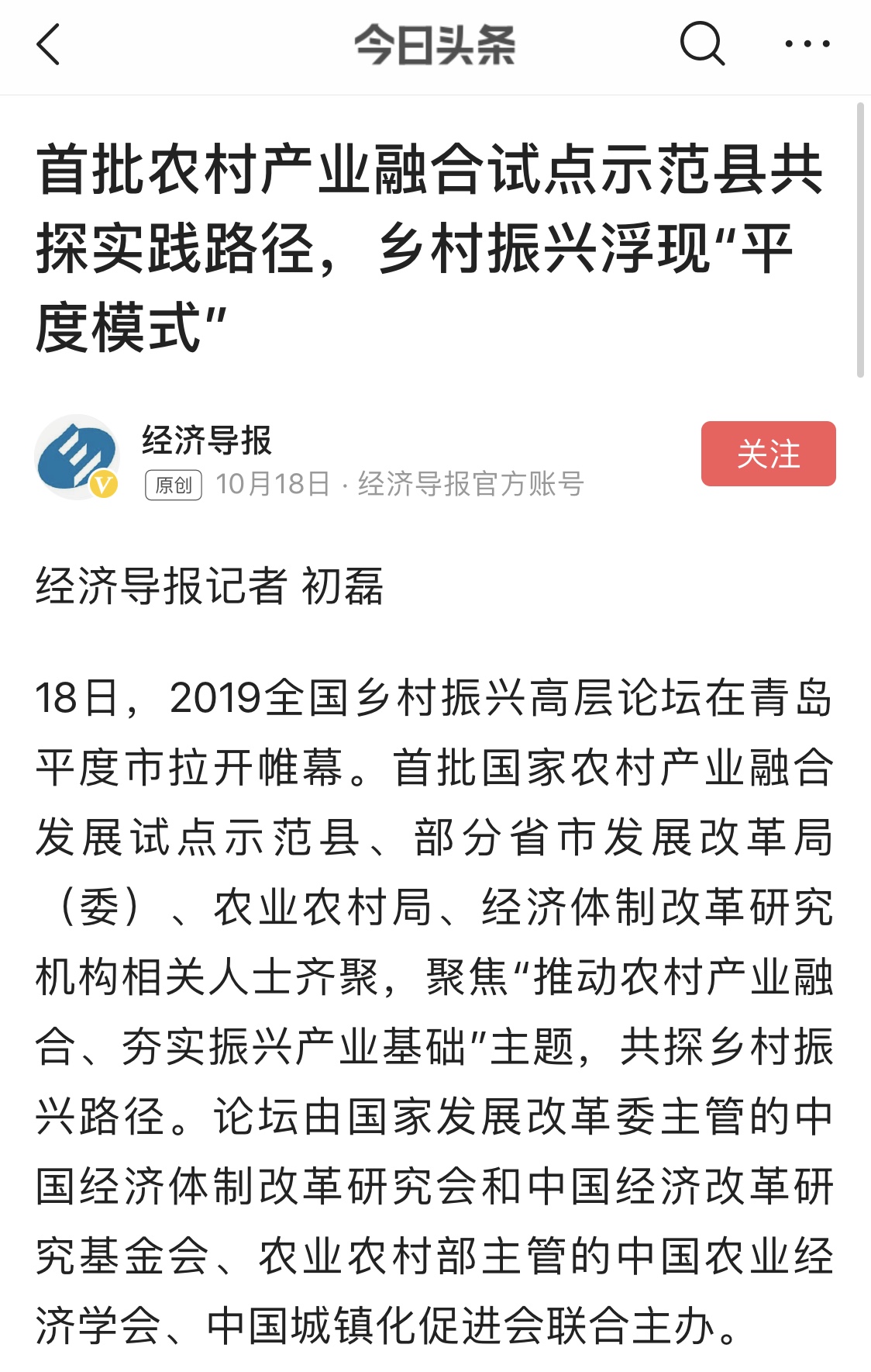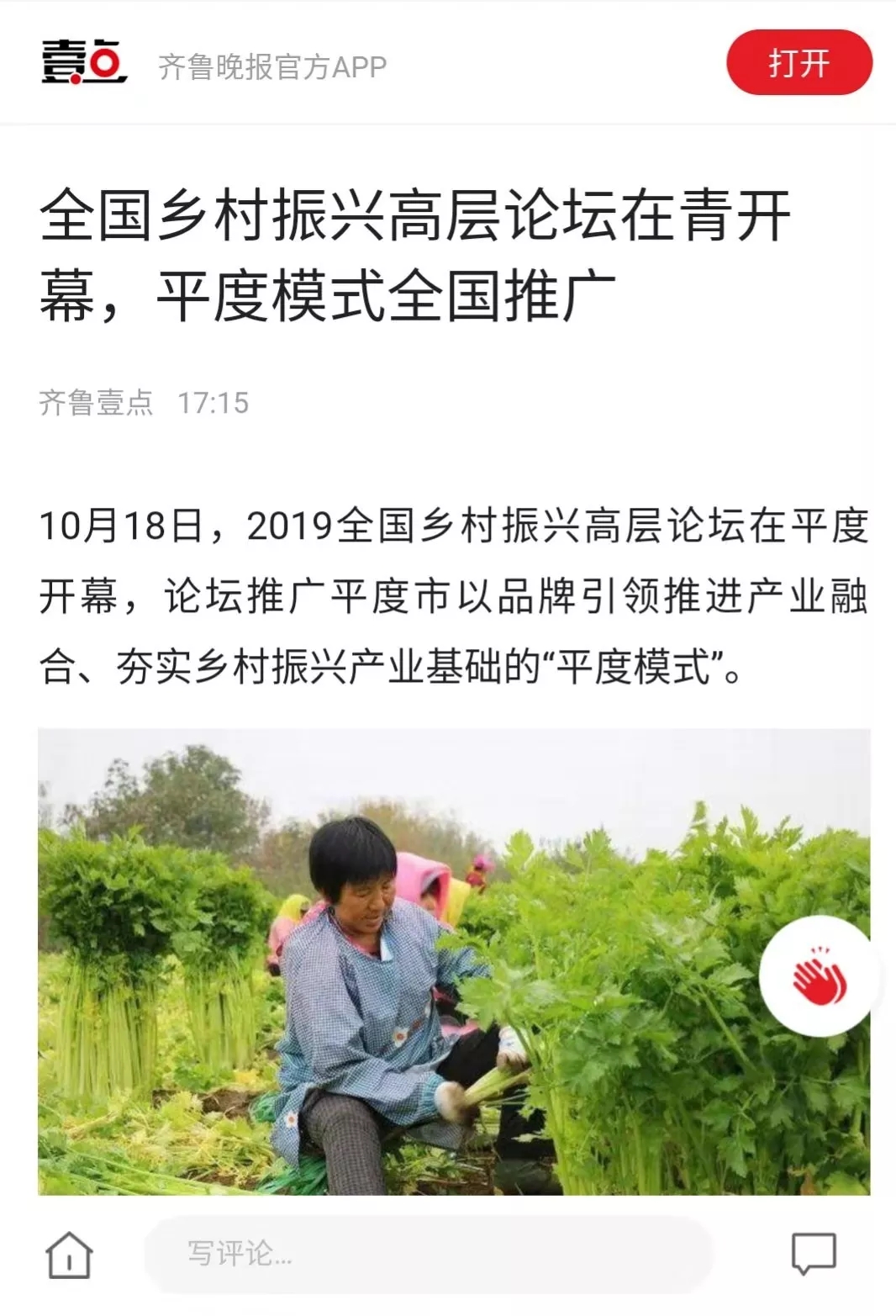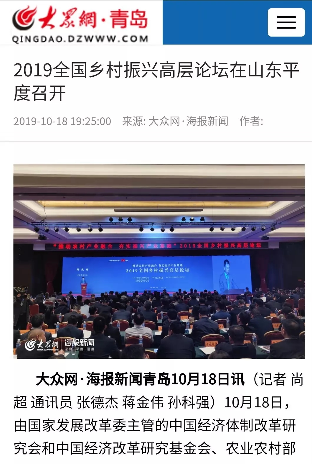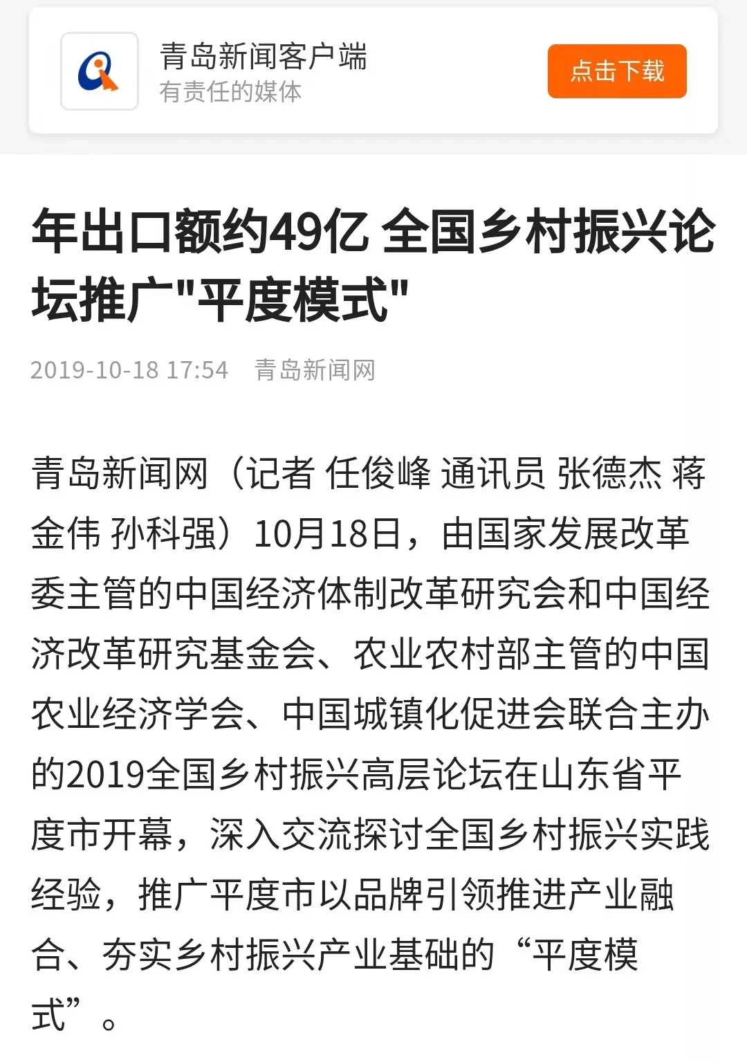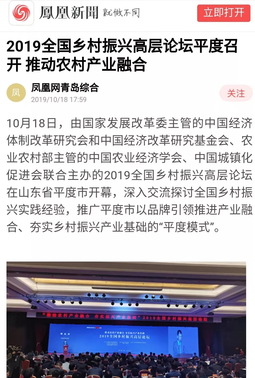 這場(chǎng)在平度舉行的國(guó)家級(jí)高層論壇受到各級(jí)新聞媒體聚焦關(guān)注,中央廣播電視總臺(tái)、人民日?qǐng)?bào)、新華社、經(jīng)濟(jì)日?qǐng)?bào)、農(nóng)民日?qǐng)?bào)、中國(guó)經(jīng)濟(jì)時(shí)報(bào)、山東廣播電視臺(tái)、大眾日?qǐng)?bào)、青島廣播電視臺(tái)、青島日?qǐng)?bào)等20余家媒體記者到現(xiàn)場(chǎng)采訪報(bào)道。10月18日上午,青島廣播電視臺(tái)藍(lán)睛客戶端現(xiàn)場(chǎng)直播論壇盛況,在線觀看已突破7萬(wàn)人次。目前,新華社、人民網(wǎng)、鳳凰網(wǎng)、青島廣播電視臺(tái)、青島日?qǐng)?bào)、齊魯晚報(bào)、青島早報(bào)、青島晚報(bào)、半島都市報(bào)、商周刊、大眾網(wǎng)、中國(guó)山東網(wǎng)、青島新聞網(wǎng)等10余家媒體第一時(shí)間已刊發(fā)相關(guān)報(bào)道。